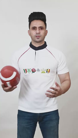 Men's Rugby Short Sleeve T-Shirt | Six Nations Supporter Fan | Grandad Collar Style | Embroidered Logo | Size S to XXL | Black, Red & White